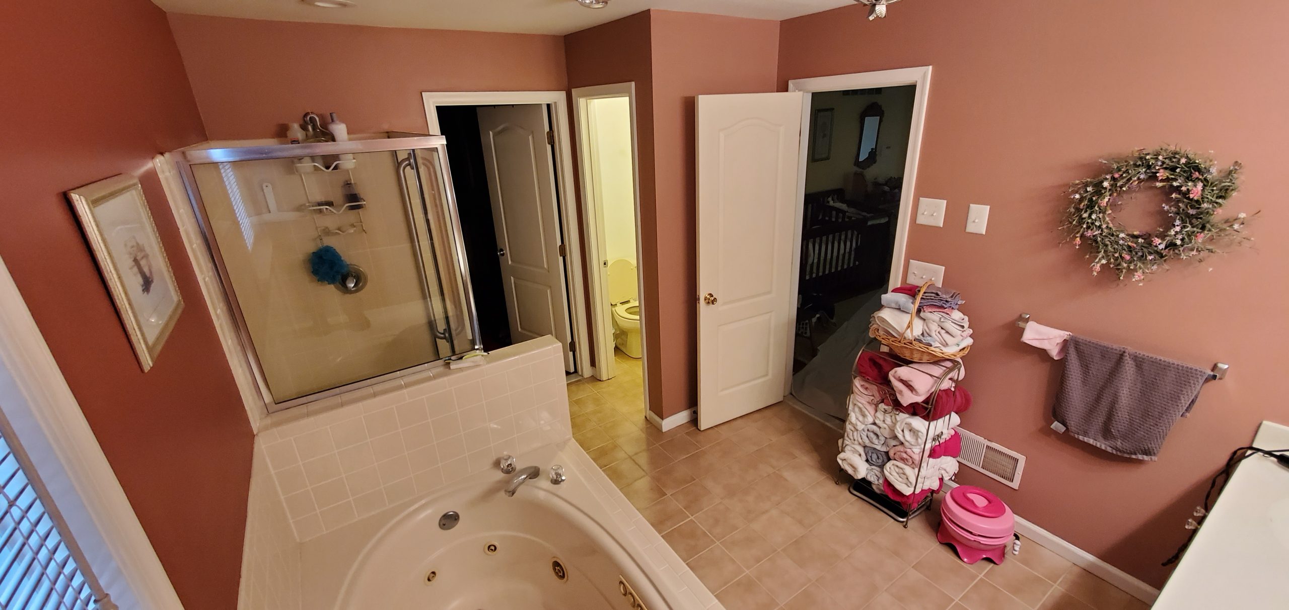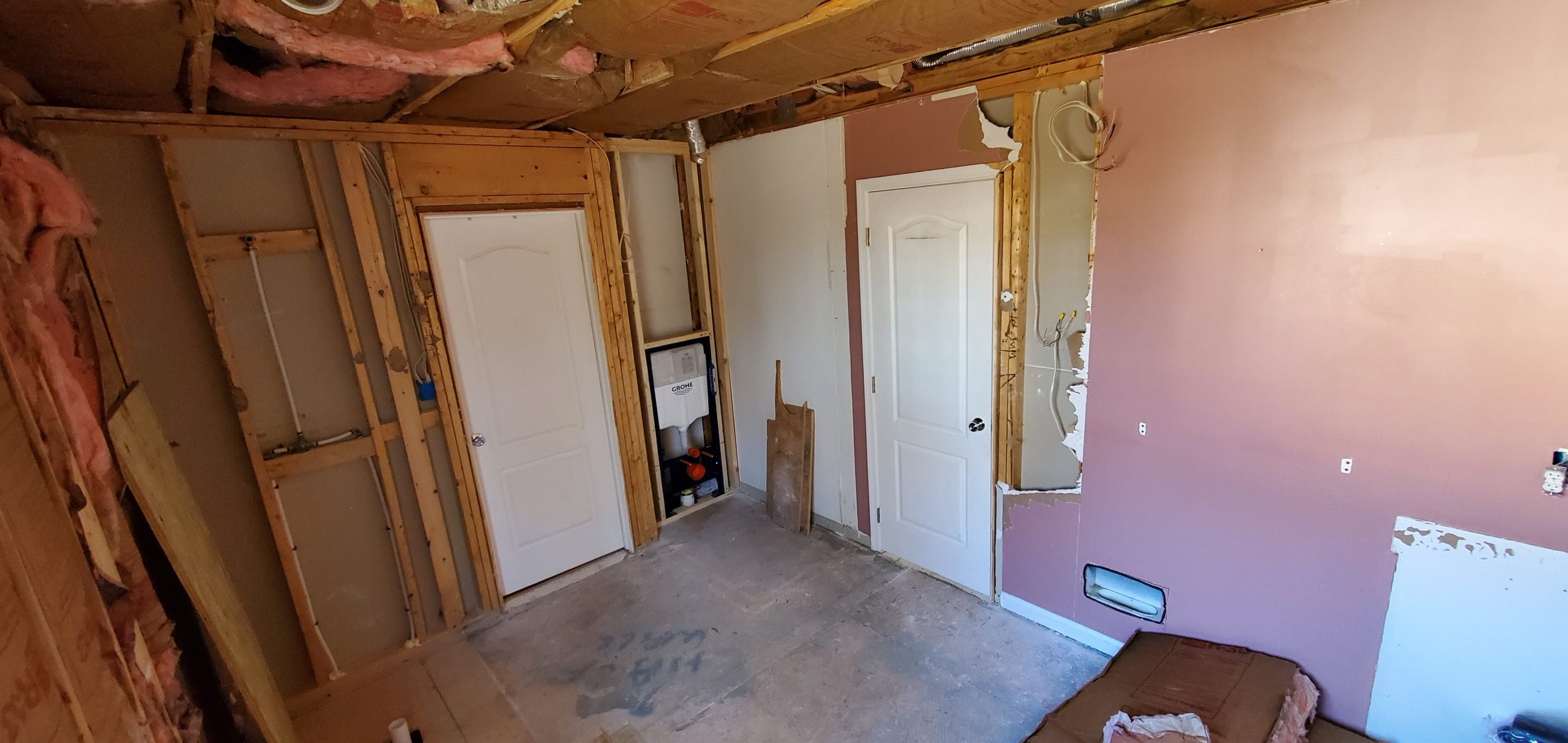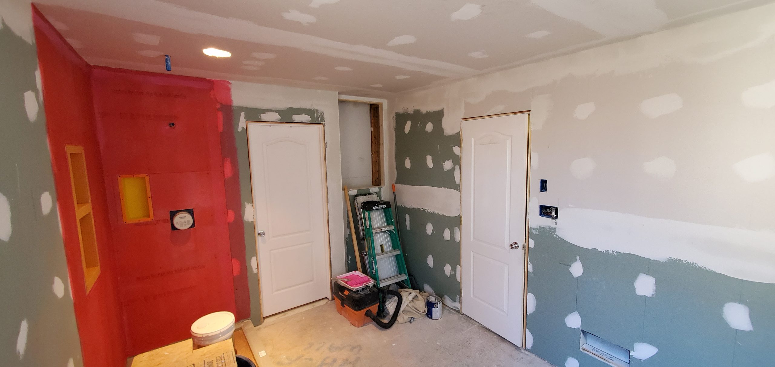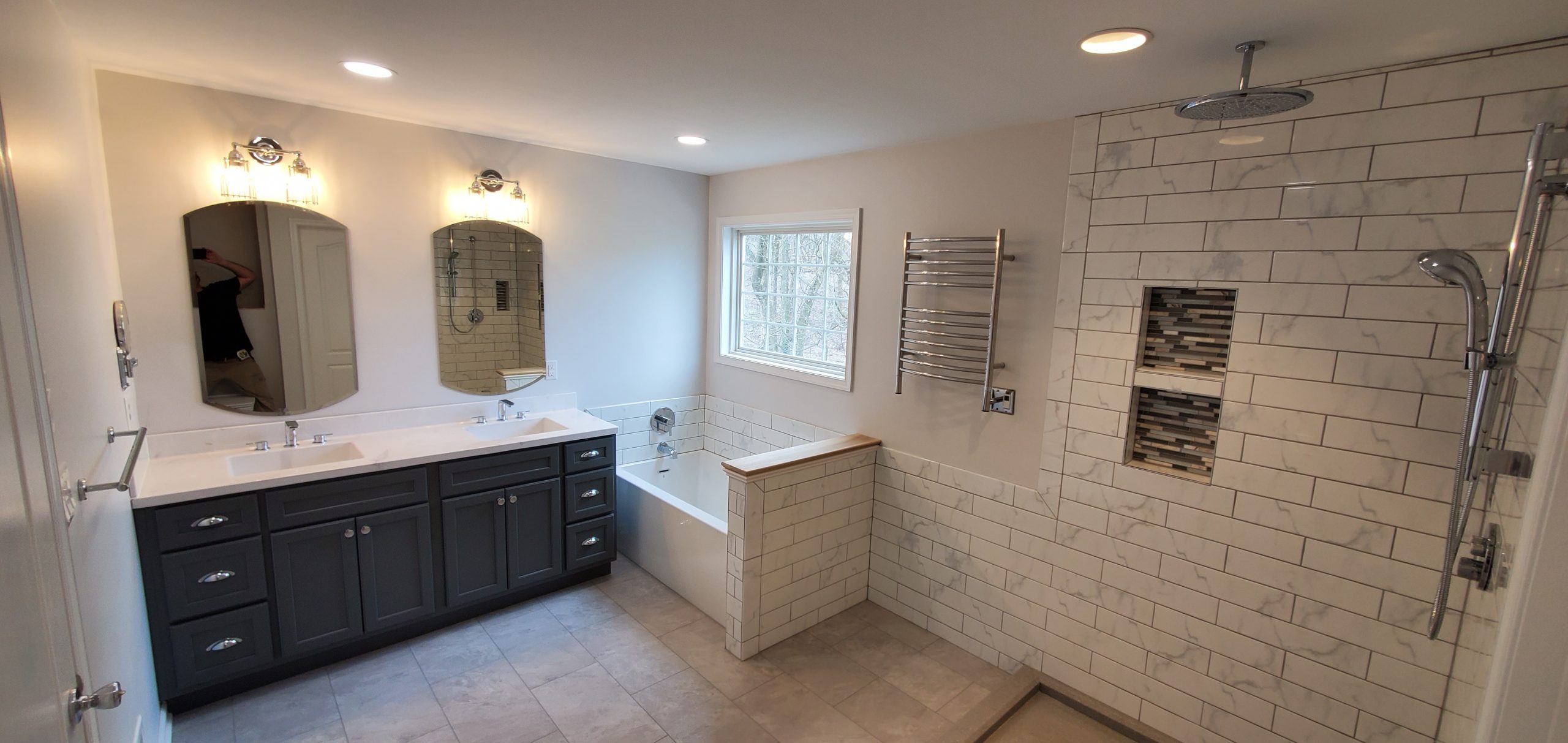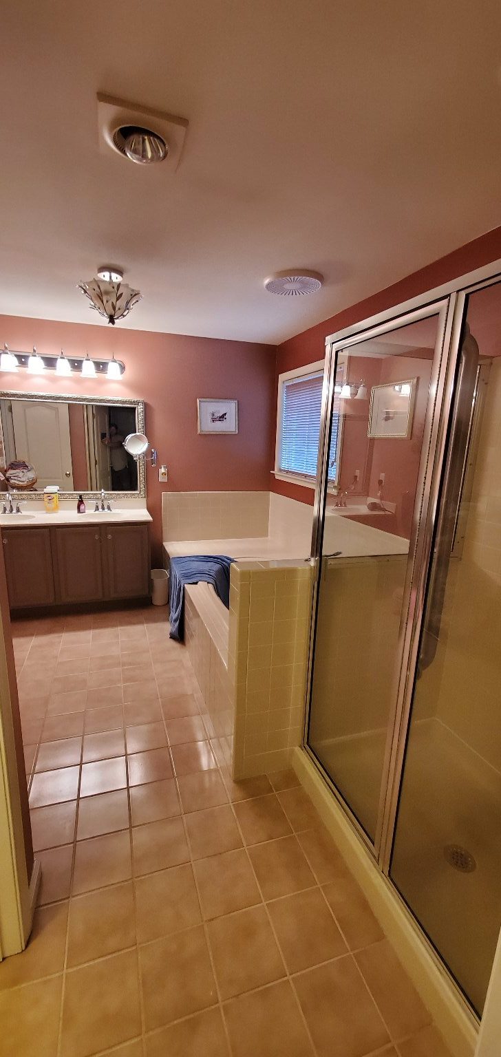 Bathroom Remodel from floor to ceiling. This project involved removing a toilet stall, and reconfiguring the room with a step-in style shower, new toilet configuration, sinks & cabinets, and flooring. (Click pictures to see full size)