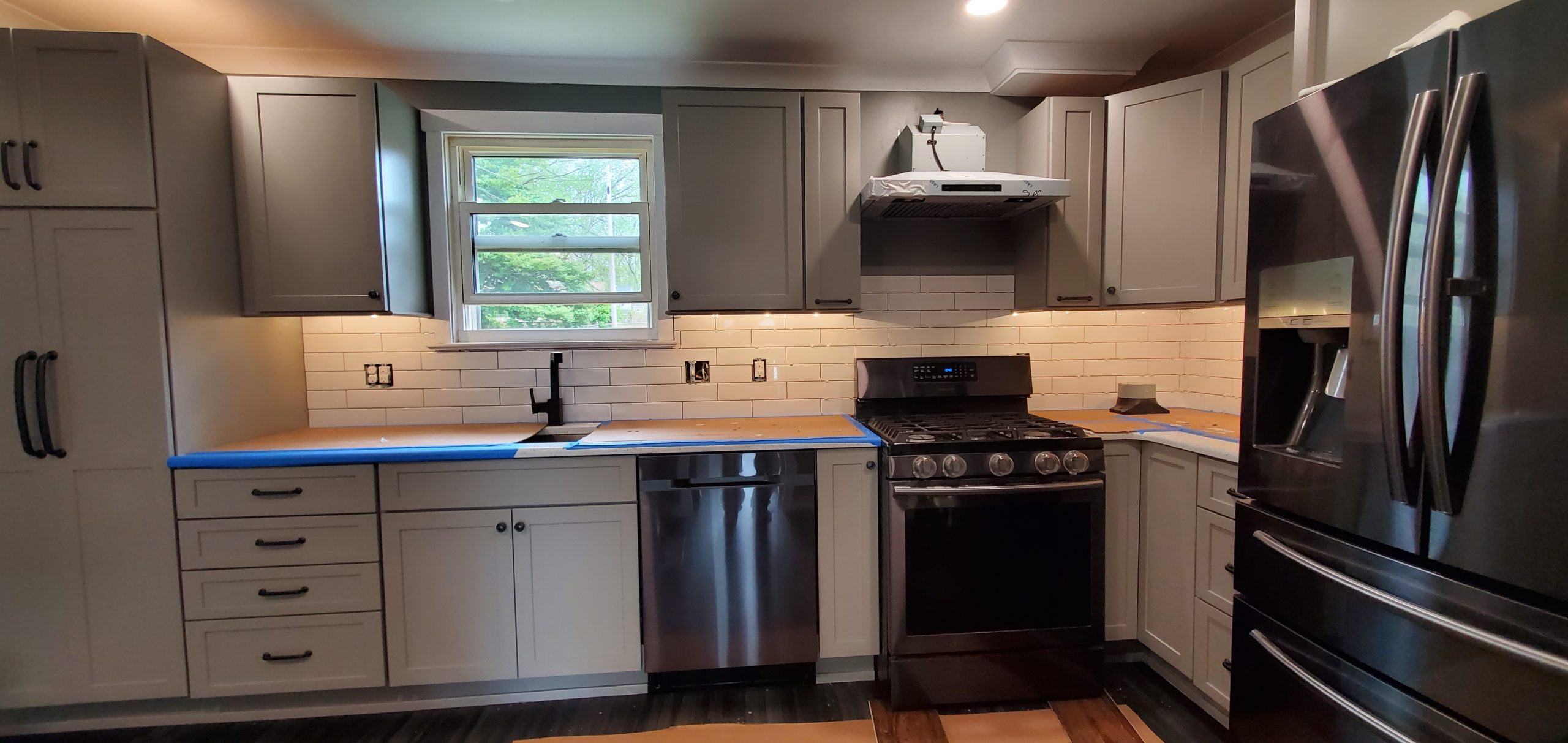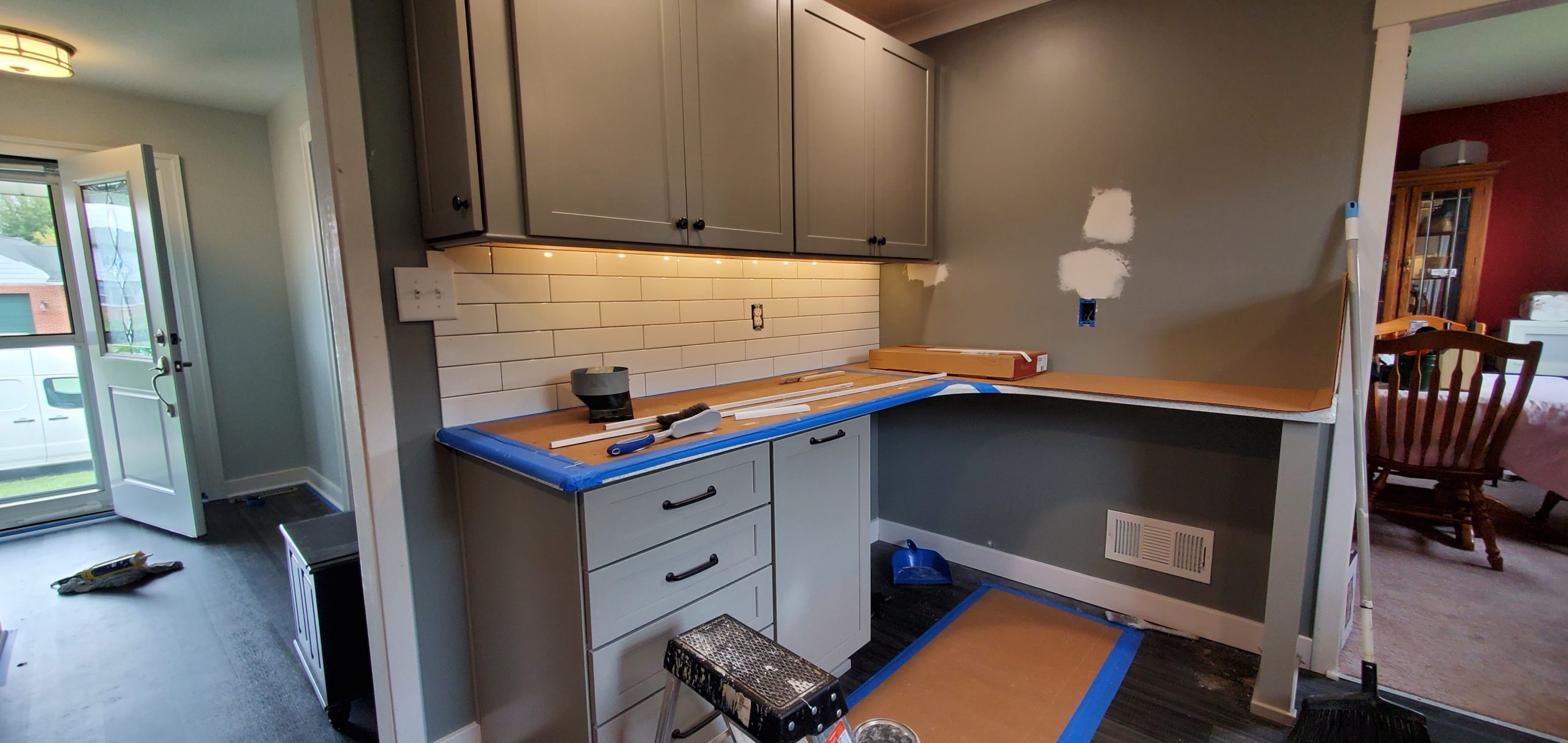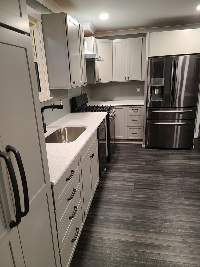 Kitchen Remodel from floor to ceiling. This project was a total kitchen redo with new flooring, cabinets, counters, and a custom built- in desk area. (Click pictures to see full size)