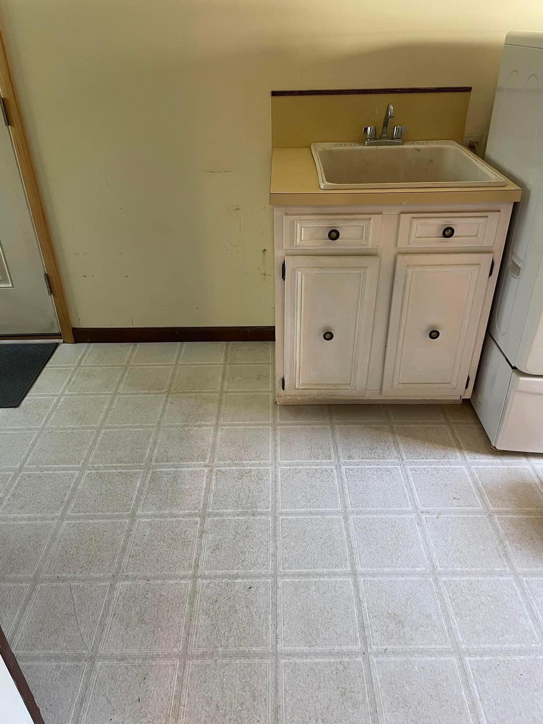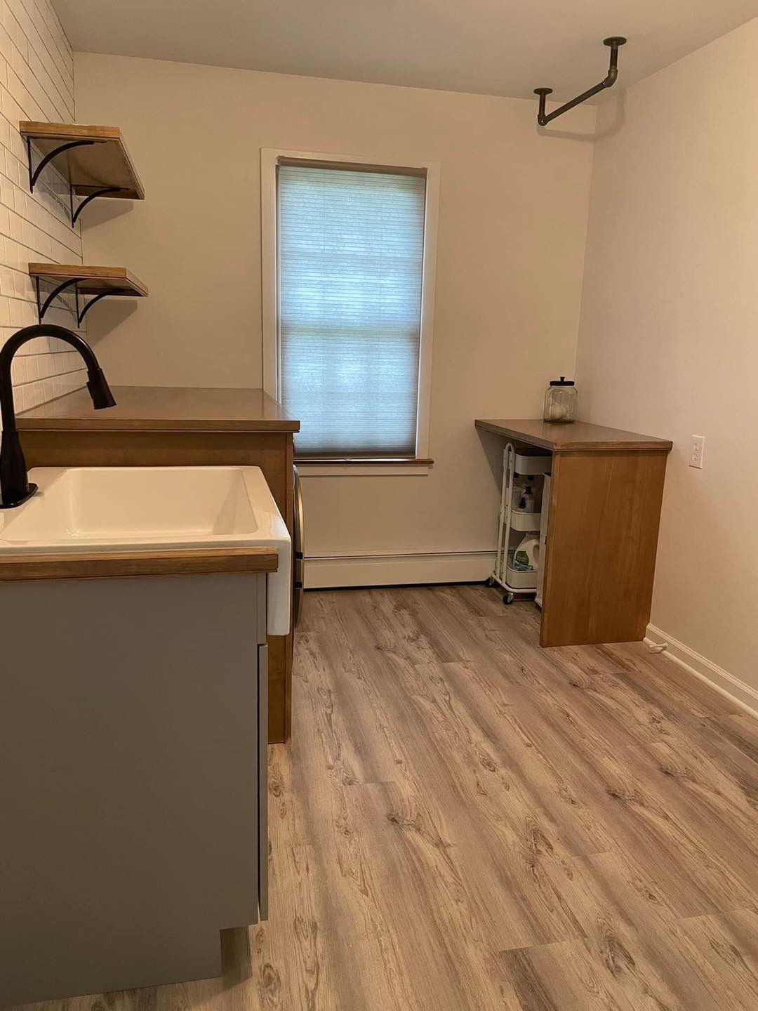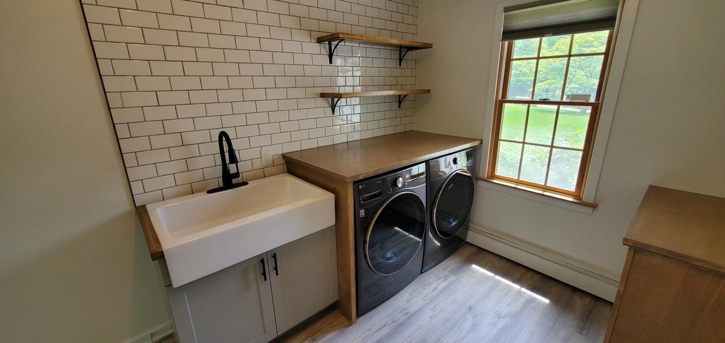 Laundry Room Makeover from floor to ceiling. These projects involved reimagining and reconfiguring the room with a new sink, new new appliance shelving, new cabinets, and flooring. (Click pictures to see full size)